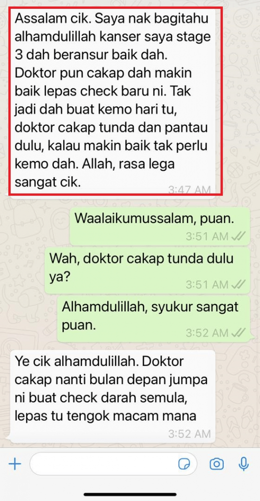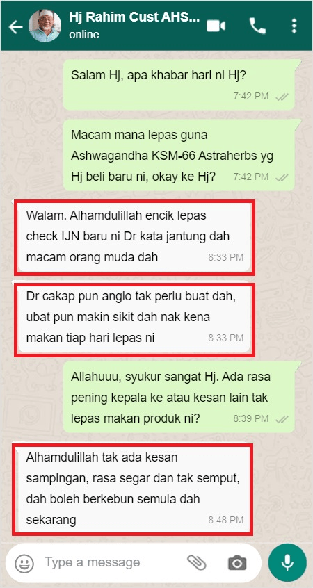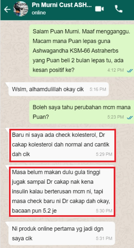“Semalam saya rasa panas di kaki sebab makan macam2. Panas di kaki itu simptom orang yg ada kencing manis. Panas yang membahang. Saya ambil 2 biji, saya makan ubat herba ini tanpa kapsul. Kapsul tu saya buka dan terus kemam. Rasanya sikit2 pahit tapi sedap. Bagi saya pahit ni ubat. Selepas 5 minit rasa panas membahang di kaki tadi hilang dengan cepat. Alhamdulillah. Sekarang bacaan gula dalam darah pun makin turun. Alhamdulillah”.